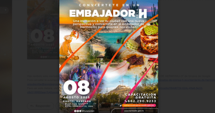 Hermosillo, Sonora.- Para fortalecer el conocimiento, la identidad y el orgullo por la ciudad, el Ayuntamiento de Hermosillo llevará a cabo este 8 de agosto el taller gratuito “Embajadores de La H” en las instalaciones del Hotel Gándara.