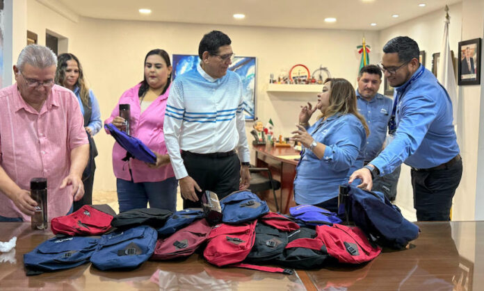 Fue el presidente municipal, acompañado por la secretaria del Ayuntamiento, María Luisa Villaseñor Angulo, quien recibió la donación, consistente en 30 mochilas y una importante cantidad de útiles escolares.