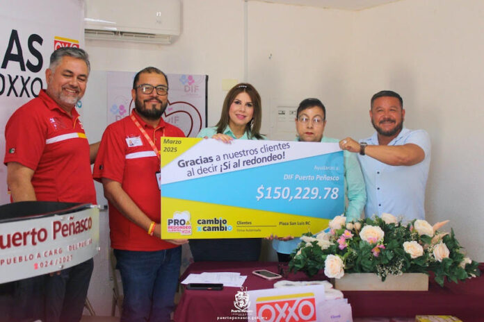 Puerto Peñasco, Sonora.- En el marco de la política social impulsada por el presidente municipal de Puerto Peñasco, Dr. Óscar Castro, y con el objetivo de fortalecer el apoyo a los sectores más vulnerables de la comunidad, el Sistema para el Desarrollo Integral de la Familia (DIF Municipal) recibió este día un donativo en especie y un cheque por $150,229.78 por parte de OXXO Plaza San Luis Río Colorado, producto de su programa de redondeo en tiendas.