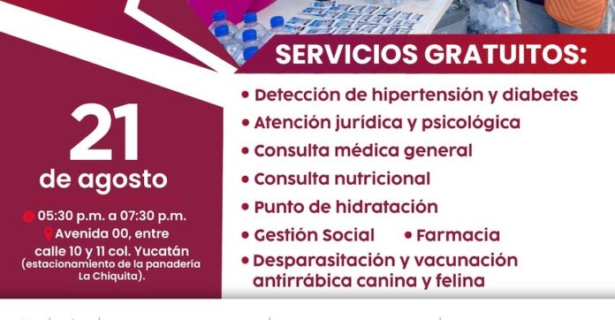 La directora de Salud Pública Municipal, Austria Castro Gracia, explicó que las familias podrán aprovechar los diferentes servicios médicos que van desde la consulta médica, gestión social, farmacia, detección de hipertensión y diabetes, punto de hidratación asesoría jurídica y psicológica, gestión social, además, habrá atención vacunación y desparasitación para mascotas, esto con el apoyo de personal de Desarrollo Social y la Coordinación de Atención a la Mujer.