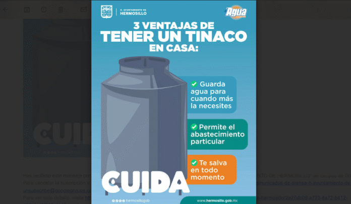 Agua de Hermosillo reiteró el llamado a utilizar tinacos en hogares y centros de trabajo, recordando que la limpieza regular de este dispositivo de almacenamiento, así como mantenerlo bien tapado todo el tiempo, es importante para garantizar la calidad del agua.