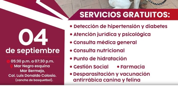 La actividad será este 4 de septiembre a partir de las 17:30 a las 19:30 horas y se ofrecerá desde consulta médica, farmacia, gestión social, desparasitación y vacunación canina y felina, detección de hipertensión y diabetes, apoyo jurídico y psicológico que brindará el personal de Desarrollo Social, la Coordinación de Atención a la Mujer y Salud Pública Municipal, indicó Austria Castro Gracia.