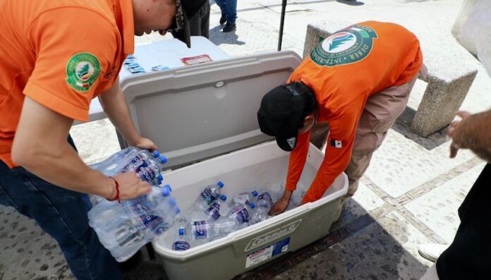 Refuerzan acciones preventivas con entrega de agua y suero; reparten 800 litros en puntos de hidratación instalados en el Centro de Gobierno y en la Clínica 2 del Instituto Mexicano del Seguro Social.