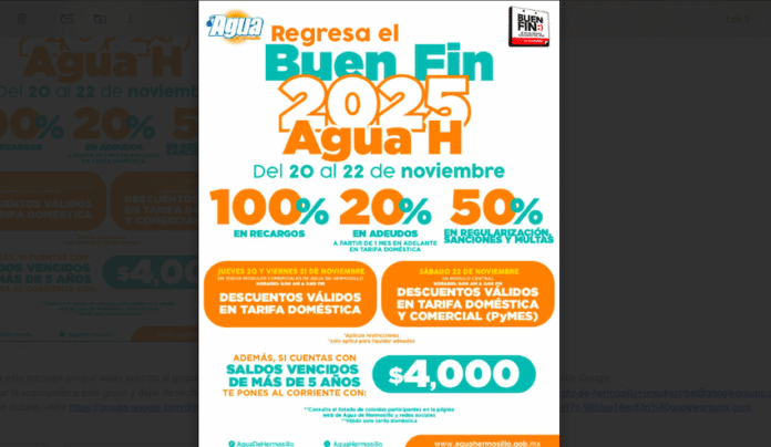 Hermosillo, Sonora.- Como parte de las promociones que Agua de Hermosillo ofrece para usuarias y usuarios que deseen ponerse al corriente, el organismo operador anunció el regreso del Buen Fin del 20 al 22 de noviembre con atractivos descuentos.