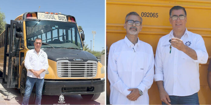 Puerto Peñasco, Sonora.- Esta mañana, el Presidente Municipal, Dr. Óscar Eduardo Castro Castro, hizo entrega oficial de un nuevo camión escolar a la Escuela Secundaria Técnica No. 37 (ETI), sumando así un total de tres unidades otorgadas a esta institución para apoyar el traslado seguro y puntual de sus estudiantes.