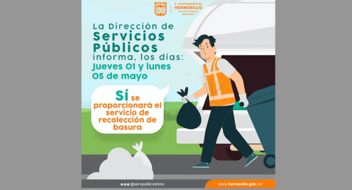 Hermosillo, Sonora.- El personal del área de recolección de la Dirección de Servicios Públicos Municipales recorrerá de forma normal los domicilios del sector Centro el próximo lunes 5 de mayo, para retirar los desechos domésticos, informó Servio Pavlovich Escalante, titular de la dependencia.
