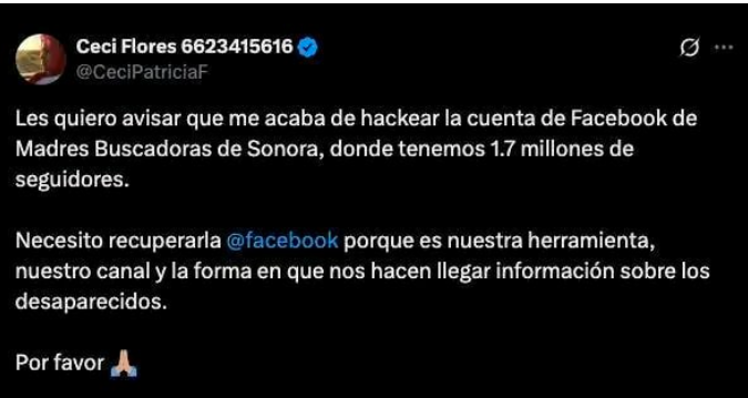 Ceci Flores, activista de 52 años y fundadora de la organización, reveló que la cuenta oficial de Facebook de Madres Buscadoras de Sonora ha sido hackeada.