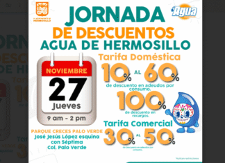 Hermosillo, Sonora..- Este jueves 27 de noviembre, Agua de Hermosillo llevará a cabo una jornada especial de descuentos dirigida a usuarios con adeudos. La atención se ofrecerá de 9:00 a.m. a 2:00 p.m. en...