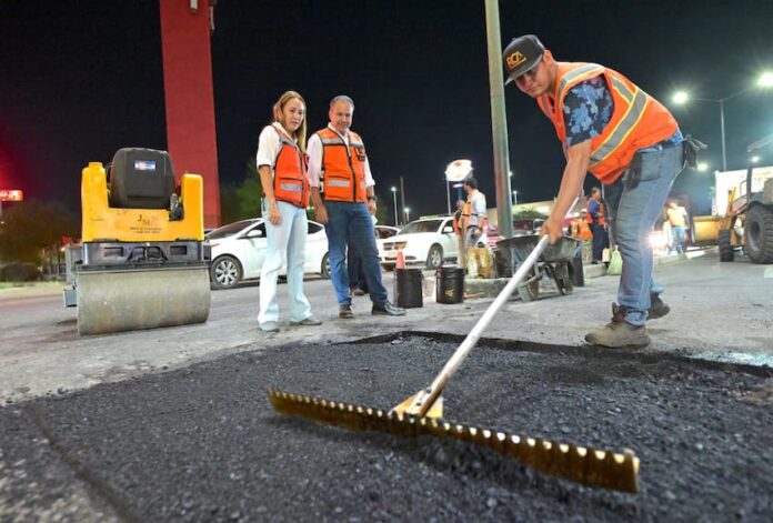 Supervisa Toño Astiazarán bacheo Nocturno en el norte de la ciudad; los trabajos forman parte del mantenimiento necesario de las rúas pavimentadas del área urbana y rural del municipio.