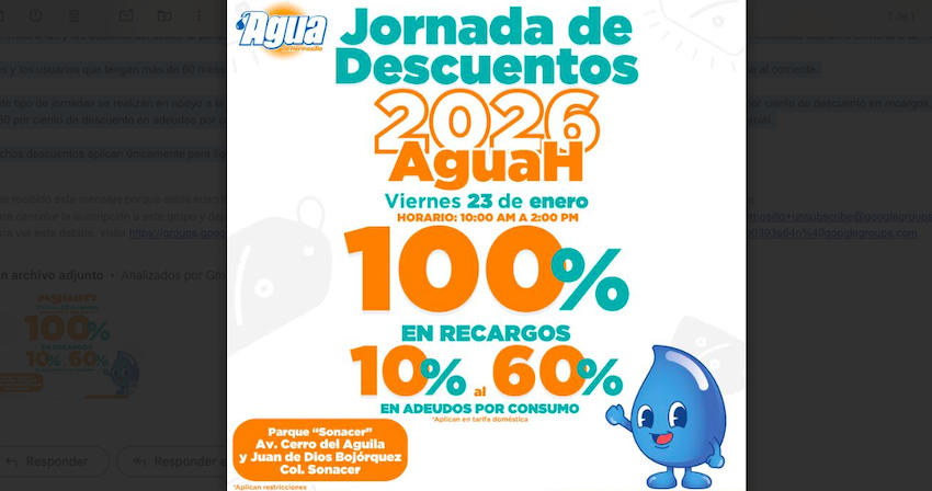 Tendrán residentes de la colonia Sonacer Jornada de Descuentos de Agua de Hermosillo; en el parque "Sonacer" en Cerro de Águila y Juan de Dios Bojórquez.