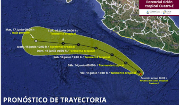 Ciudad de México.- Durante las próximas horas, el potencial ciclón tropical Cuatro-E ocasionará lluvias intensas (de 75 a 150 milímetros [mm]) en Michoacán, Guerrero y Oaxaca; muy fuertes (de 50 a 75 mm) en Jalisco, Colima, Morelos, Puebla y Estado de México, así como fuertes (de 25 a 50 mm) en Nayarit, Guanajuato, Querétaro, Hidalgo, Ciudad de México y Tlaxcala.