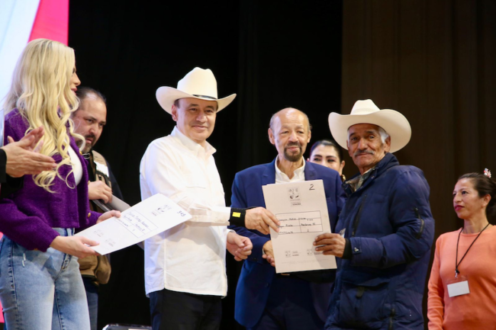 El titular del Ejecutivo estatal destacó que con esta entrega se garantiza la tranquilidad de las familias y sus derechos legales sobre viviendas y terrenos, consolidando la prosperidad de la ciudadanía beneficiada. Aunado a este compromiso, el mandatario estatal entregó un cheque por ocho millones de pesos, correspondiente al último pago a los ejidatarios del municipio, para la continuidad de la construcción del puente de Agua Prieta.