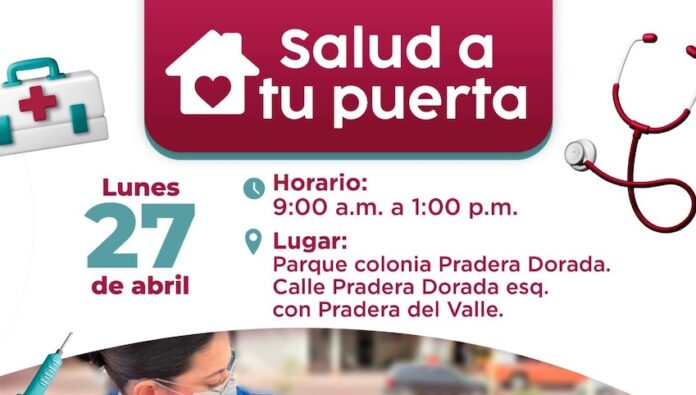 A través del programa Salud a tu puerta, las familias podrán acceder a consulta médica general, detección de hipertensión y diabetes, consulta nutricional, servicio de farmacia, atención jurídica y psicológica y para el bienestar de las mascotas, vacunación antirrábica y desparasitación canina y felina; la cita será en el parque de la colonia ubicado en calle Pradera Dorada esquina con Pradera del Valle, en horario de 9:00 a.m. a 13:00 p.m.