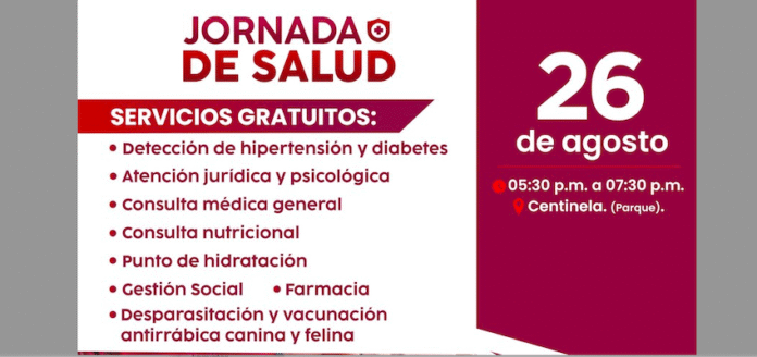 El Ayuntamiento de Guaymas a través de Desarrollo Social, Salud Pública Municipal y la Coordinación de la Mujer llevarán la Jornada de Salud donde gratuitamente los vecinos podrán acceder a consulta médica, gestión social, atención jurídica y psicológica, detección de hipertensión y diabetes, punto de hidratación, farmacia, orientación nutricional, mientras que para las mascotas habrá vacunación y desparasitación, esto en horario de 17:30 a 19:30 horas.