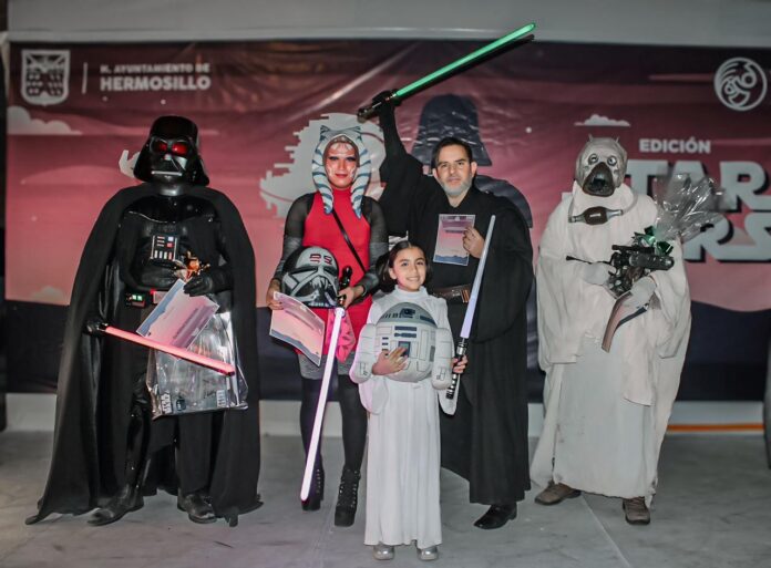 Hermosillo, Sonora; 15 de diciembre de 2025.- La fuerza acompañó a decenas de familias que asistieron a la exitosa exhibición de Star Wars en la Plaza Zaragoza, organizada por Víactiva donde también se premiaron los mejores disfraces de esta popular saga creada por George Lucas.