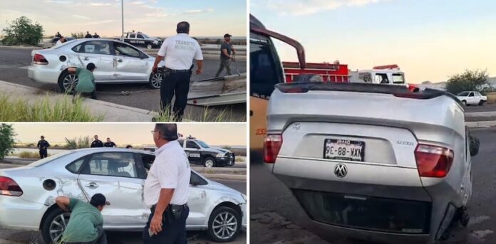 Guaymas, Sonora.- La tarde de este día lunes ocurrió el volcamiento de un automóvil en la carretera internacional, tramo Guaymas-Empalme, a la altura del Puente Douglas, con resultado de una persona herida y daños materiales.