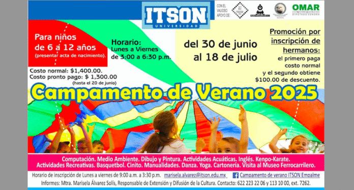 “El campamento 2025 de ITSON Empalme iniciará el treinta de junio y terminará el 18 de julio, esperándose un estimado de, al menos, ochenta niños, como ha sido el promedio”, declaró Álvarez Solís.